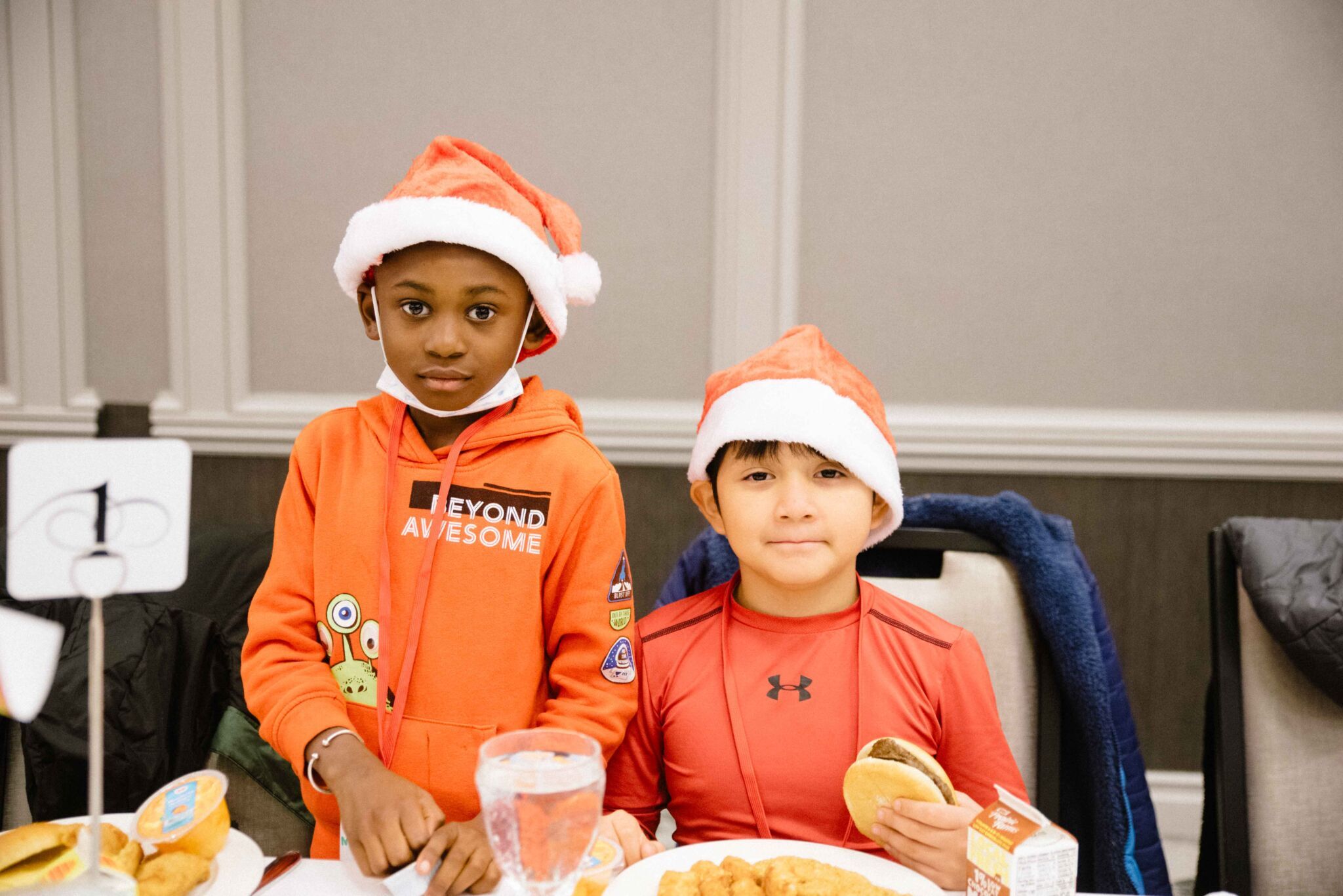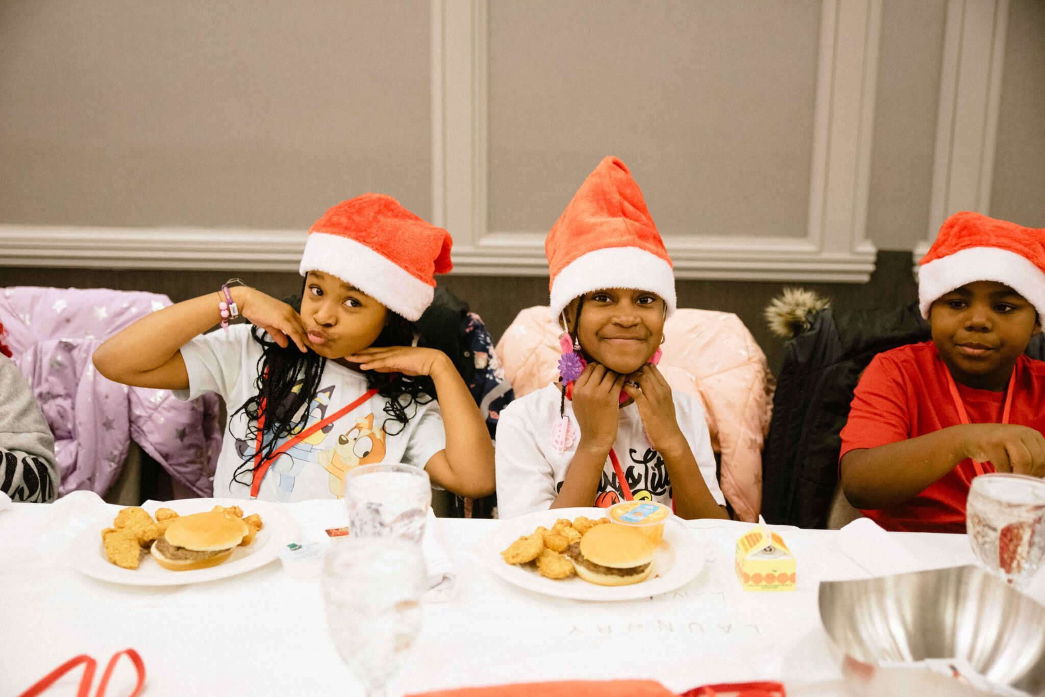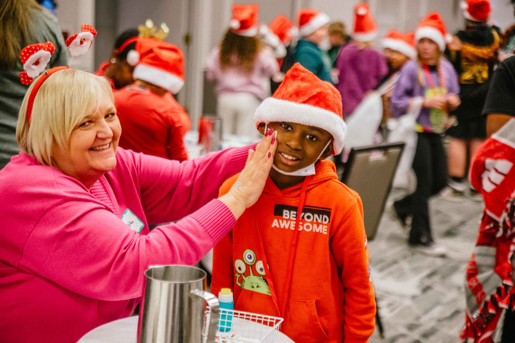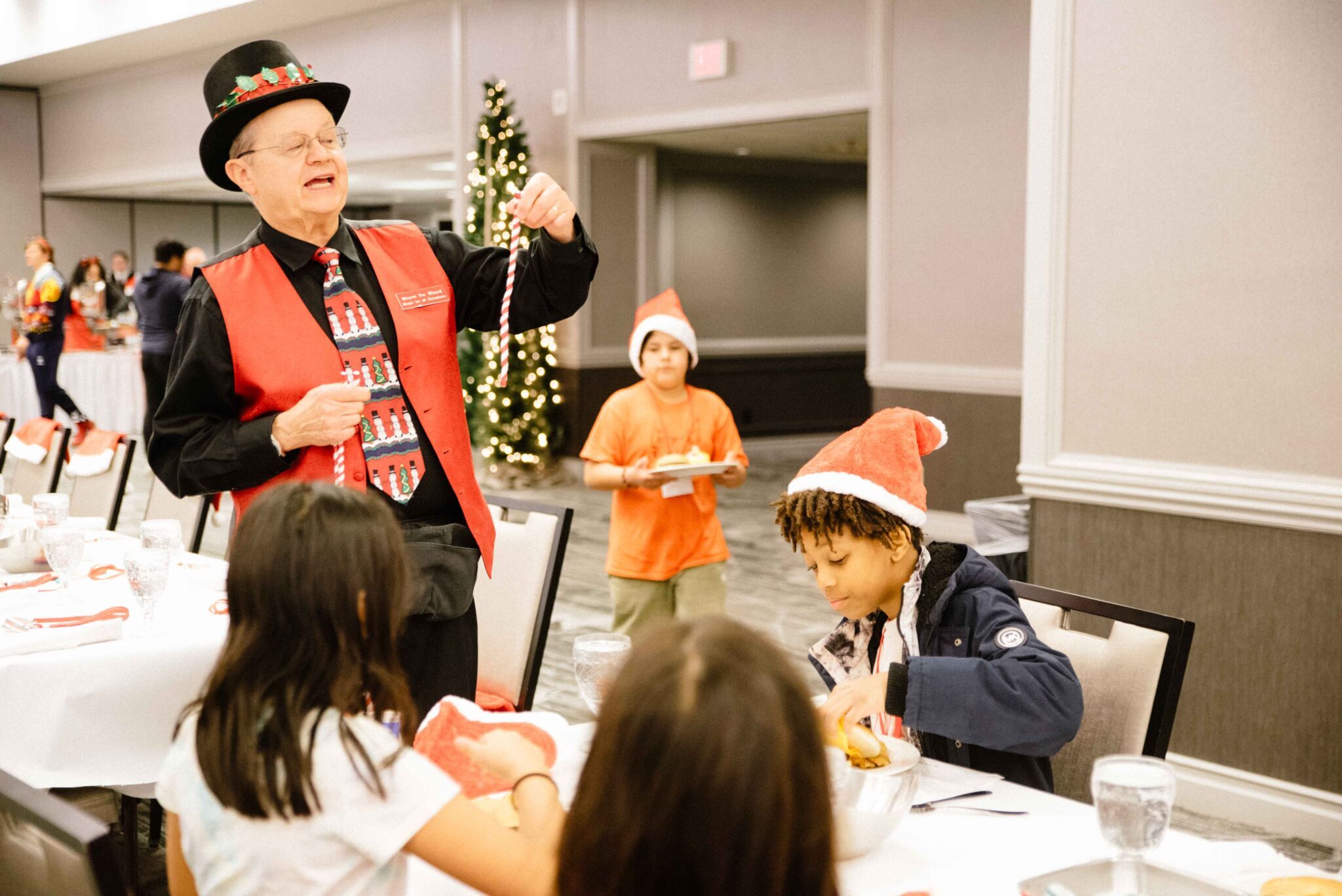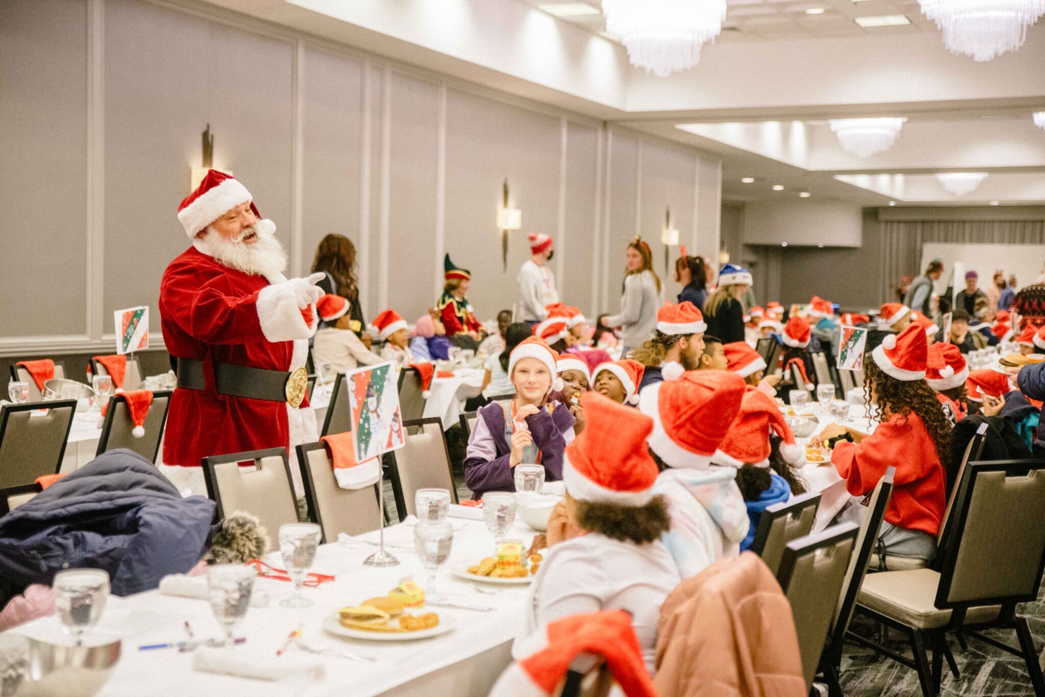 The evening began with a dinner complete with cheeseburgers, chicken nuggets, chocolate milk, cupcakes, and more. Following their meal, the children participated in various activities including photos by Lifetouch Photography with Santa, Mrs. Claus, and the Grinch; cookie decorating; crafts with Revel; magic from local magician Wayne the Wizard; and the Madison Fire Department dropped by to hand out junior fire hats.
