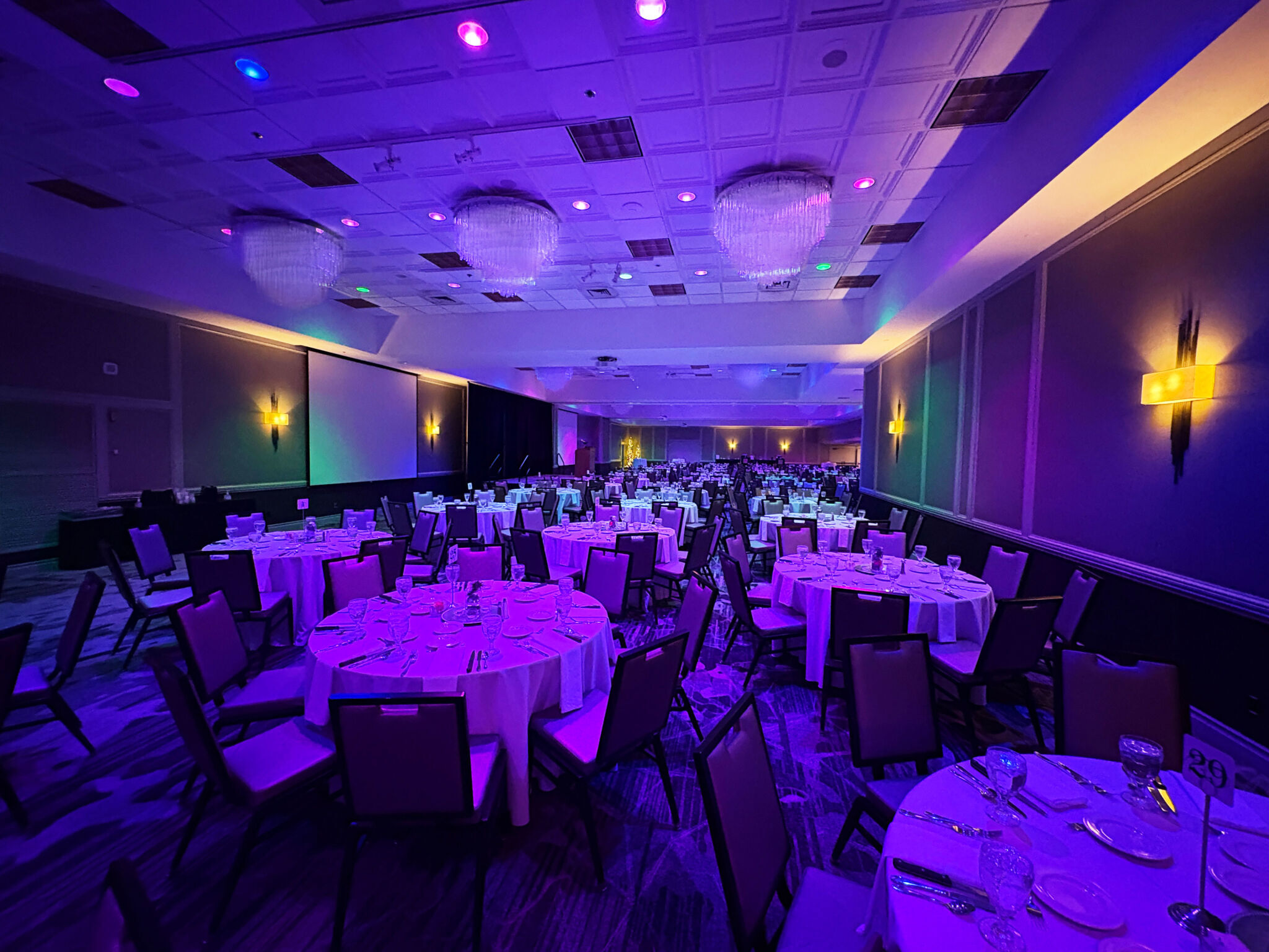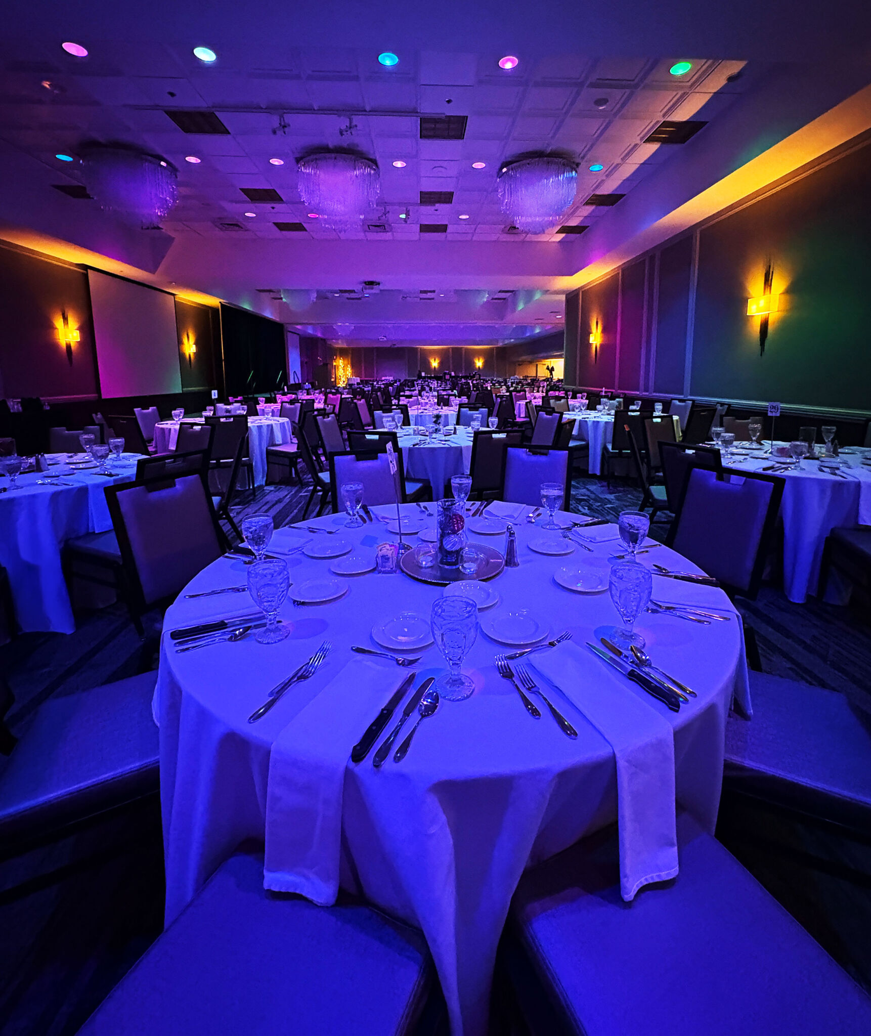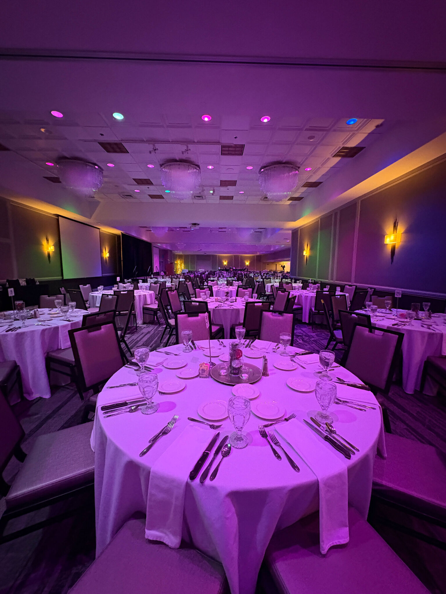Our Banquet Department recently added some enhanced lighting in the ballroom! All of our overhead can lights in our ballrooms are now smart bulbs that can change colors and even be programmed for some special effects. You can add these lighting options when you book a wedding or event with us!