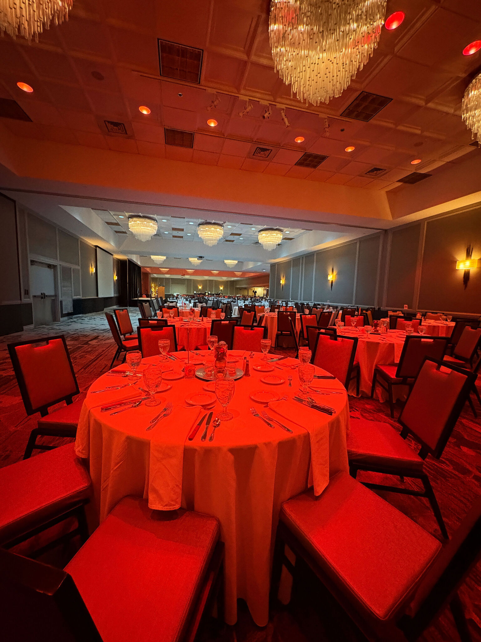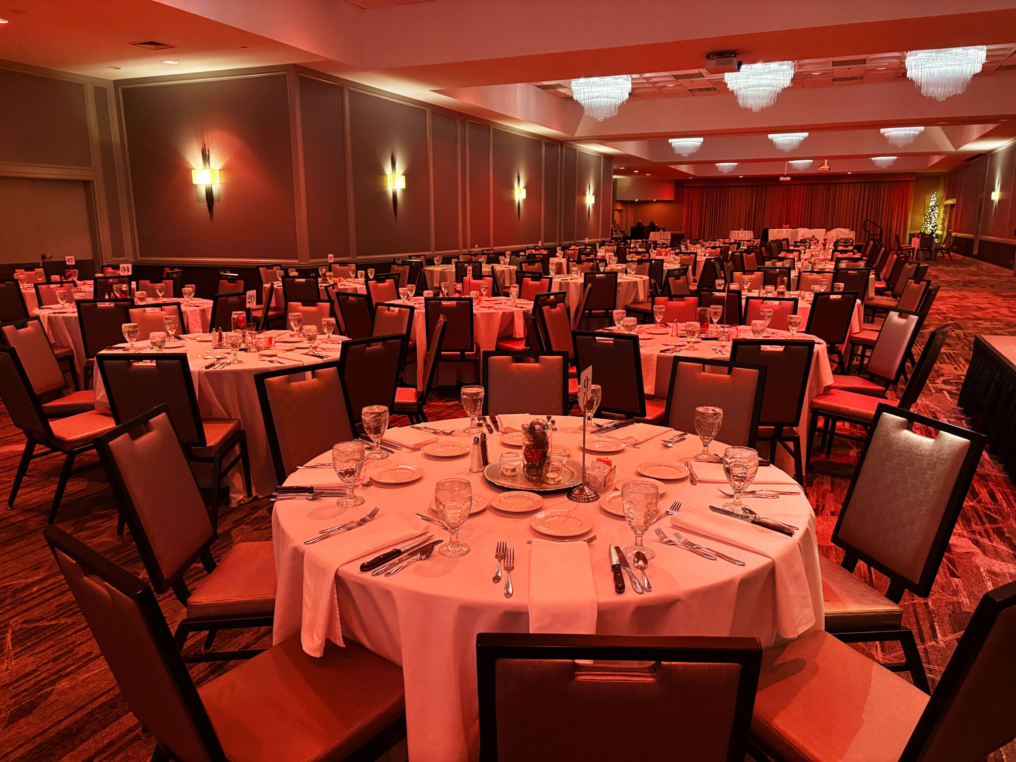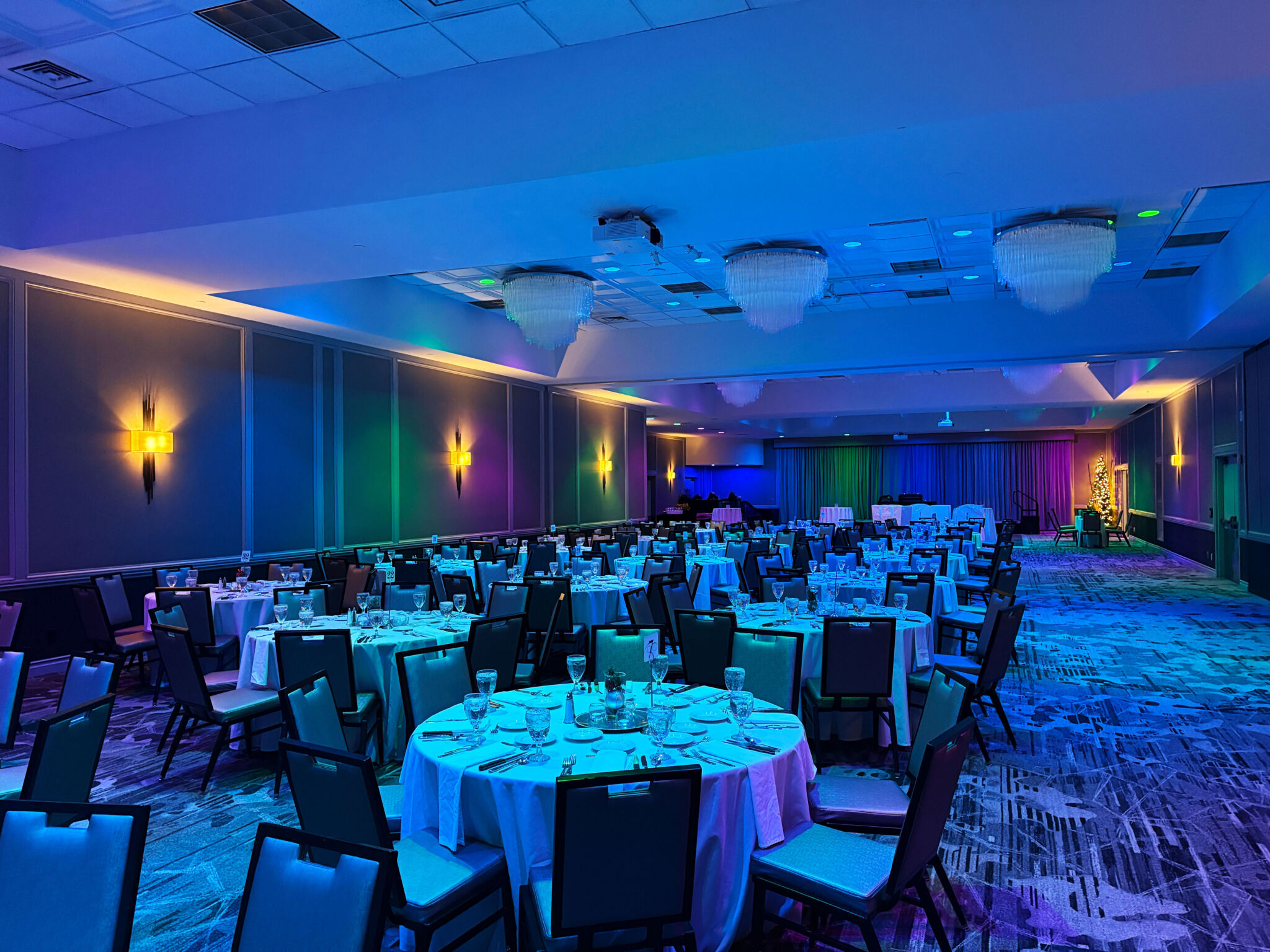 Our Banquet Department recently added some enhanced lighting in the ballroom! All of our overhead can lights in our ballrooms are now smart bulbs that can change colors and even be programmed for some special effects. You can add these lighting options when you book a wedding or event with us!